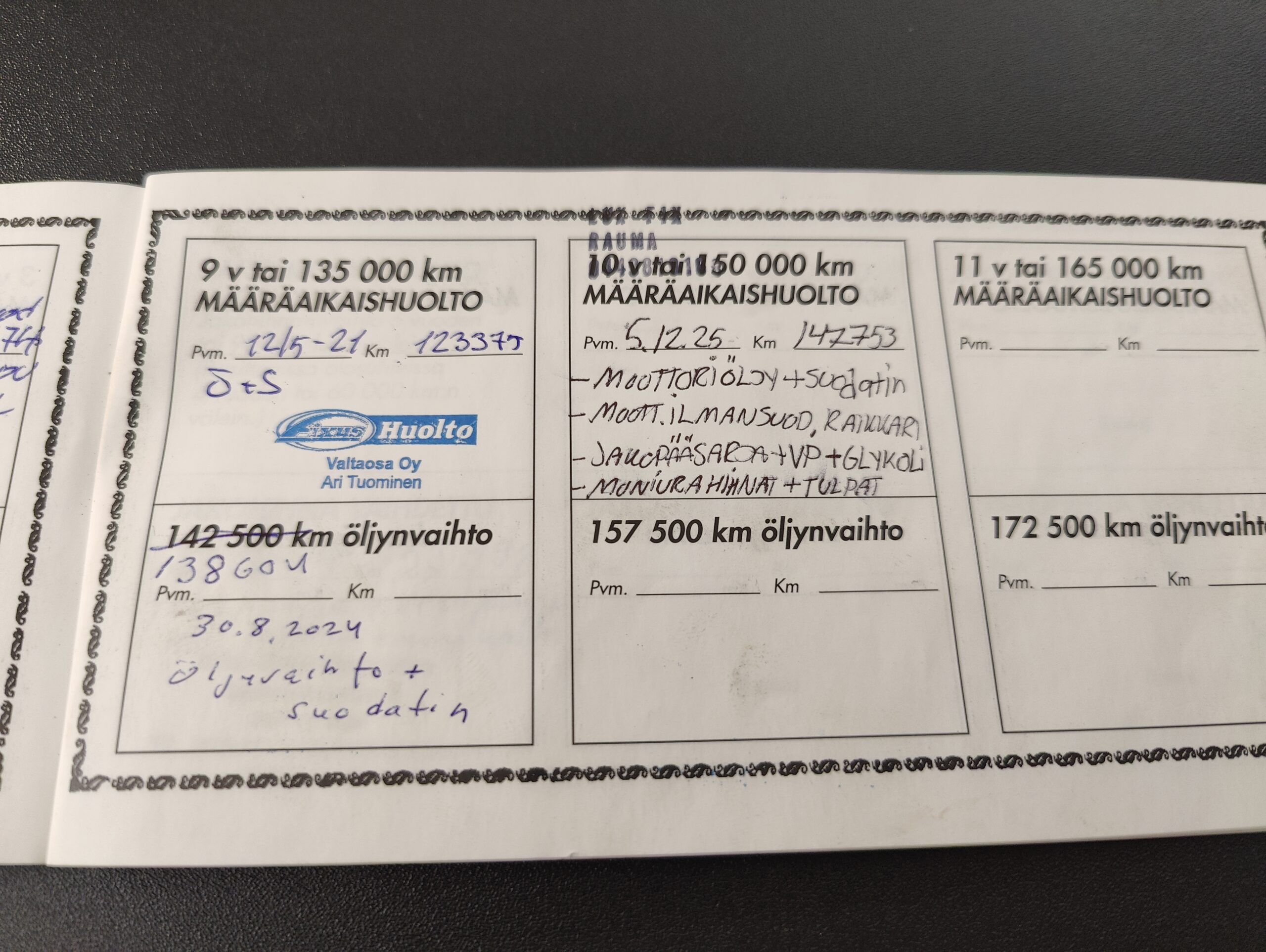 Huoltokirja on kuvattuna kokonaisuudessaan, sieltä näkee muut aikaisemmat huollot.